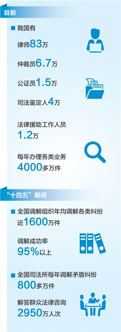 “十四五”期间,民生福祉的法治保障更加坚实,公共法律服务体系更加健全完善。目前,我国有律师83万、仲裁员6.7万、公证员1.5万、司法鉴定人4万、法律援助工作人员1.2万,每年办理各类业务4000多万件。
